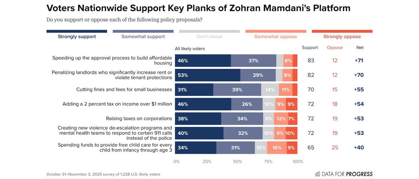 Still, despite this being the biggest electoral mandate in over 56 years, right-wing Democrats and conservatives insist on downplaying this moment. Ross Douthat, the conservative clown at the New York Times, scrambled to post his opinion article titled, “Zohran’s Victory Is Less Significant Than You Think,” reciting the tired, dead-end strategy of ‘just move to the center and win over Republicans!’ His argument? That just because Zohran won in ‘liberal’ New York, it doesn’t mean it will translate to the rest of the country. But it’s exactly this elite arrogance that causes Democrats to lose or barely inch over the finish line every single election; the idea that people don’t know what they’re voting for and need to be pandered to. It turns out, polls show the exact opposite of Douthat’s theory. Nationwide, 83% support building more affordable housing, 82% support penalizing landlords for rent gouging, 72% support taxing the top 1% more, 72% support raising corporate taxes, and 65% support funding free child care.