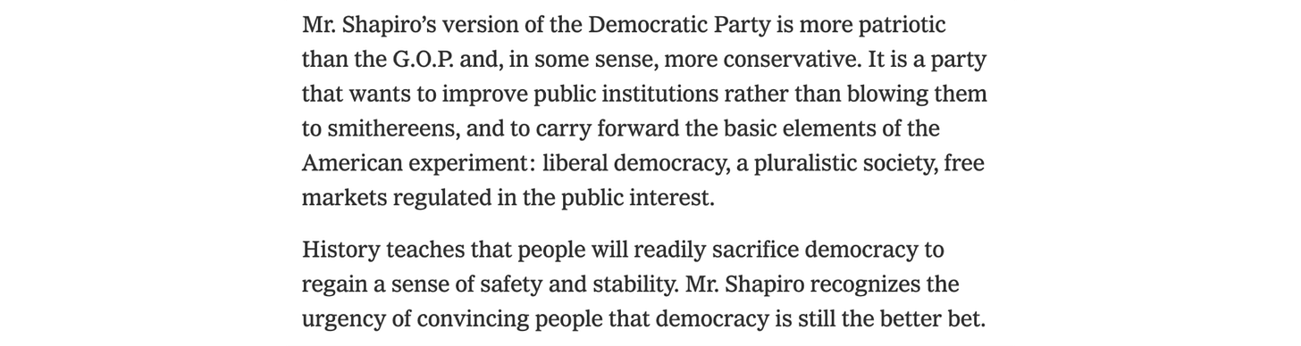 The article is predominantly just a puff piece for Shapiro, but the most confusing part is how Appelbaum describes what “Mr. Shapiro’s version of the Democratic Party” is. He says it’s “more patriotic than the GOP and, in some sense, more conservative,” citing how Shapiro wants to improve public institutions rather than dismantle them, along with this vague notion of ‘democracy’ that liberals obsessively cling to in their messaging. First off, if Democrats are trying to be the more ‘conservative’ party, they’ve already lost. And trying to be the more ‘patriotic’ party while the other side is rallying racist nationalism to throw immigrants in concentration camps is, at best, a strategy for failure, and at worst, is saying Democrats should try to out-fascist the fascists. That’s the literal reading of what he’s saying. Still, Appelbaum is doing this weird thing, trying to redefine political terms, making it seem like defending institutions is somehow the ‘conservative,’ ‘patriotic’ position. It’s not; protecting liberal institutions is liberalism. You’re not going to trick conservatives who think they want ‘small government’ into thinking they actually want a fairer society regulated by institutions just because you say you’re a patriot.