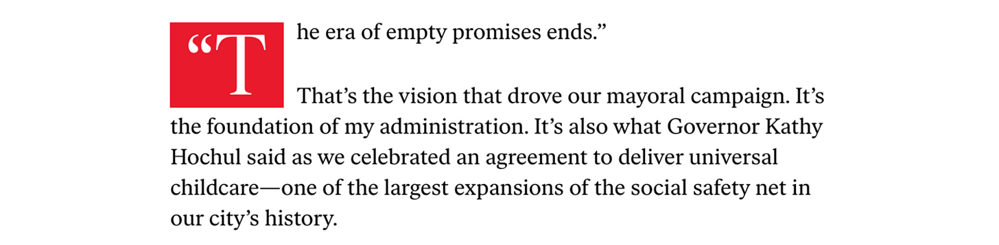 Last November, when Zohran won a massive victory against the repulsive creep Andrew Cuomo for the second time, I framed the first quarter of my article as triumphant, that a grassroots candidate had finally beaten a dynasty politician backed by millions in corporate bribes. However, I hedged that optimism in the latter three-quarters, being skeptical that one, Zohran would even be able to deliver on his agenda, and two, that he was even dedicated to challenging the establishment. I still think this was fair to express some degree of hope. But more importantly, doubt, especially since all Zohran gave us at the time was promises and rhetoric.